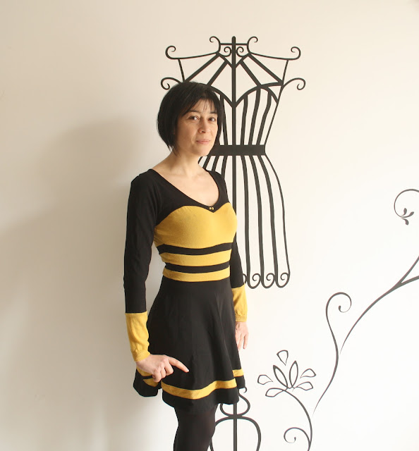 Abito da giorno, con gonna a mezza ruota, in maglina nera(misto cotone e poliestere) e maglia color senape (pura lana vergine).